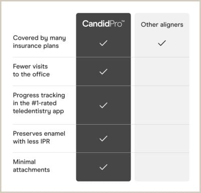 Unlike other clear aligner systems, the CandidPro package involves fewer visits, requires minimal attachments, preserves enamel with less IPR, and features progress-tracking using the #1-rated teledentistry app, CandidMonitoring™.